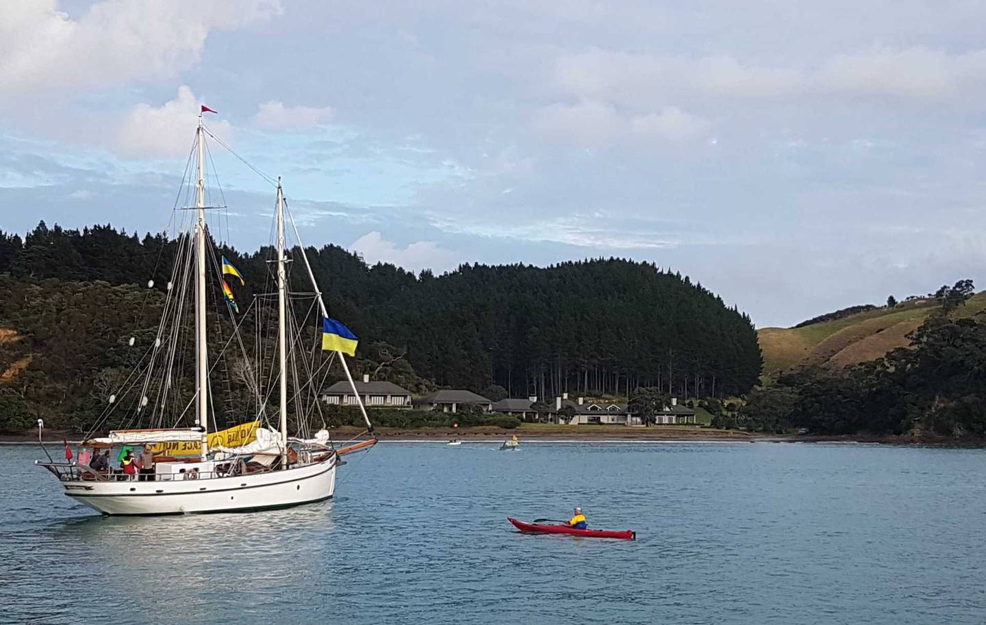 A peace flotilla against the invasion of Ukraine has arrived outside the lodge of Russian oligarch Alexander Abramov in Helena Bay, Northland.Â