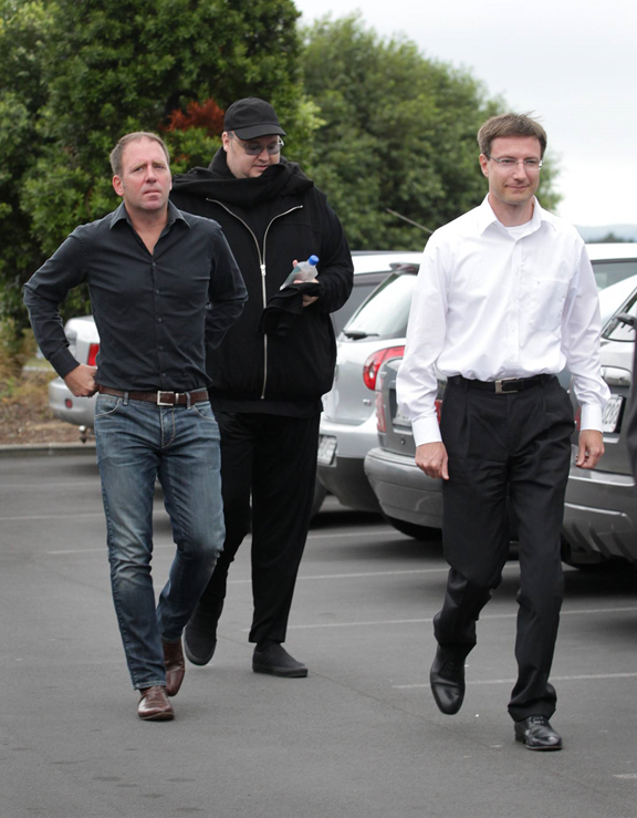 Megaupload founder Kim Dotcom flanked by co-accused Finn Batato (left) and Mathias Ortmann. Photo / File