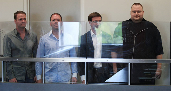 Bram van der Kolk, Finn Batato, Mathias Ortmann and Kim Dotcom at their first court appearance in 2012. Photo / File