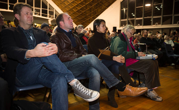 Finn Batato during a 2013 public meeting about the GCSB, flanked by former Labour leader David Cunliffe and Mona Dotcom, then married to Kim Dotcom. Photo / File