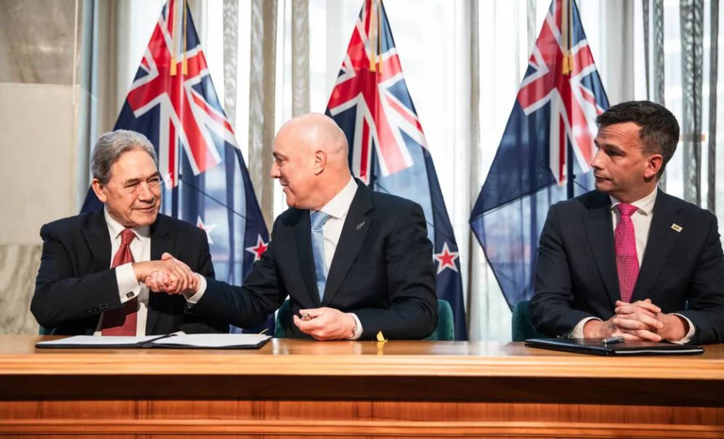 Prime Minister Christopher Luxon and NZ First leader Winston Peters seal their coalition deal in November. Photo / RNZ - Samuel Rillstone