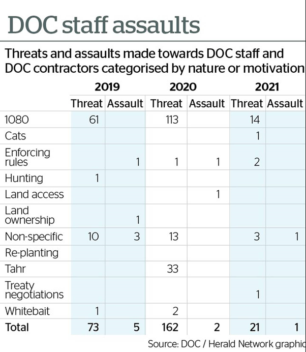 The provided records showed opposition to 1080 had been behind 61 threats in 2019, 113 in 2020, and 14 so far this year, compared with 33 incidents related to DOC's tahr operations in the South Island last year.