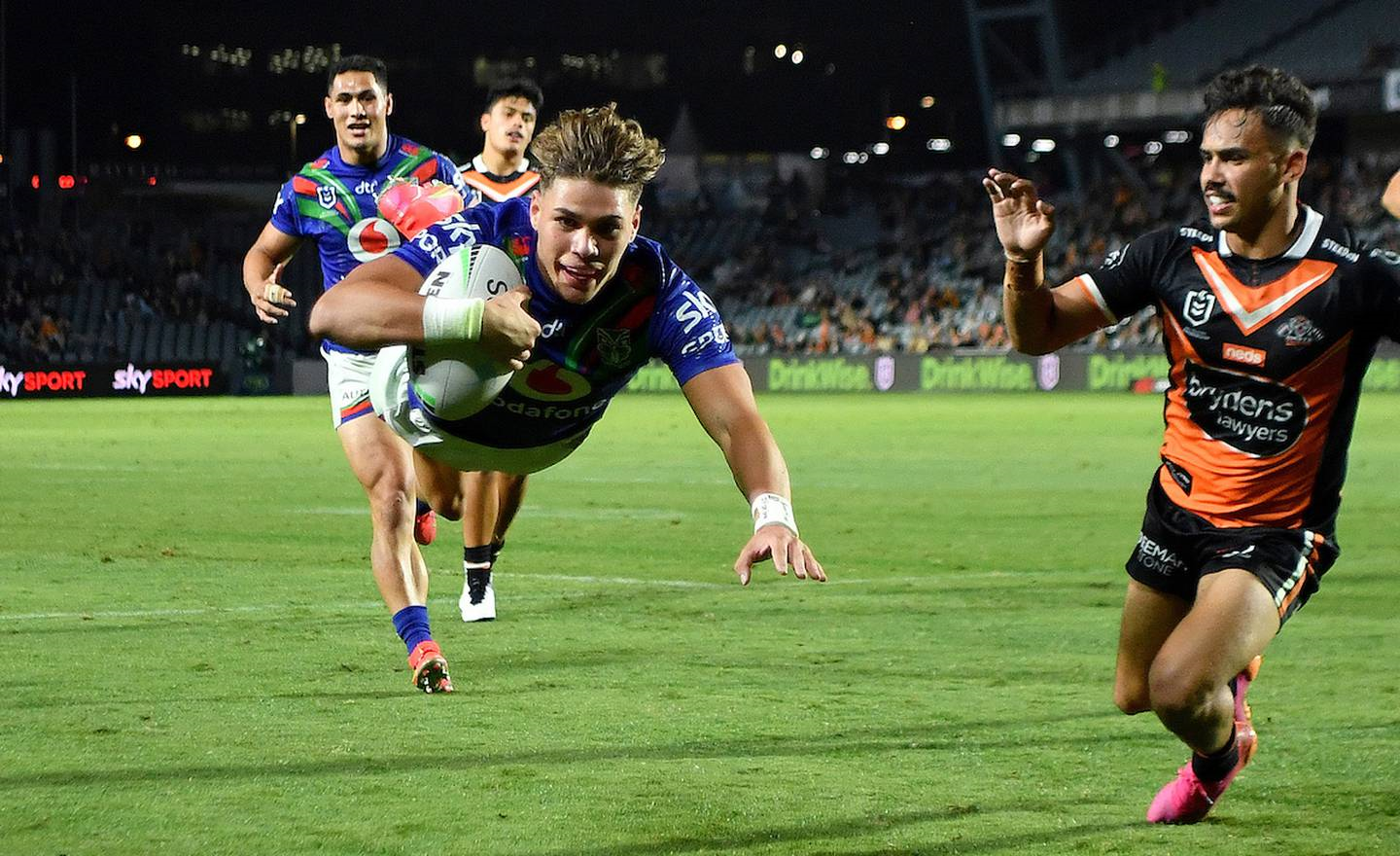 Reece Walsh dives to score against the Tigers. Photo / Photosport