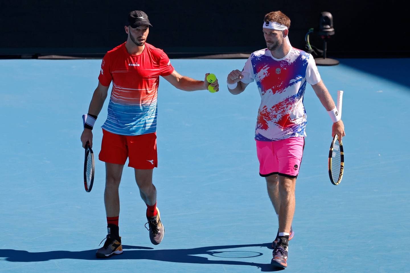 Germany's Tim Puetz and Michael Venus of New Zealand react during their doubles match against Nick Kyrgios and Thanasi Kokkinakis. Photo / AP