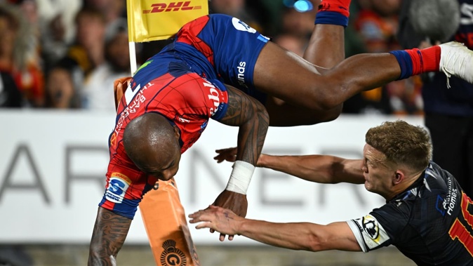 The Herald has viewed footage of a Chiefs staff member, wearing a red medical bib, booting the ball away after Blues wing Mark Tele’a scored in the corner in the 39th minute. Blues playmaker Harry Plummer missed the subsequent sideline conversion.