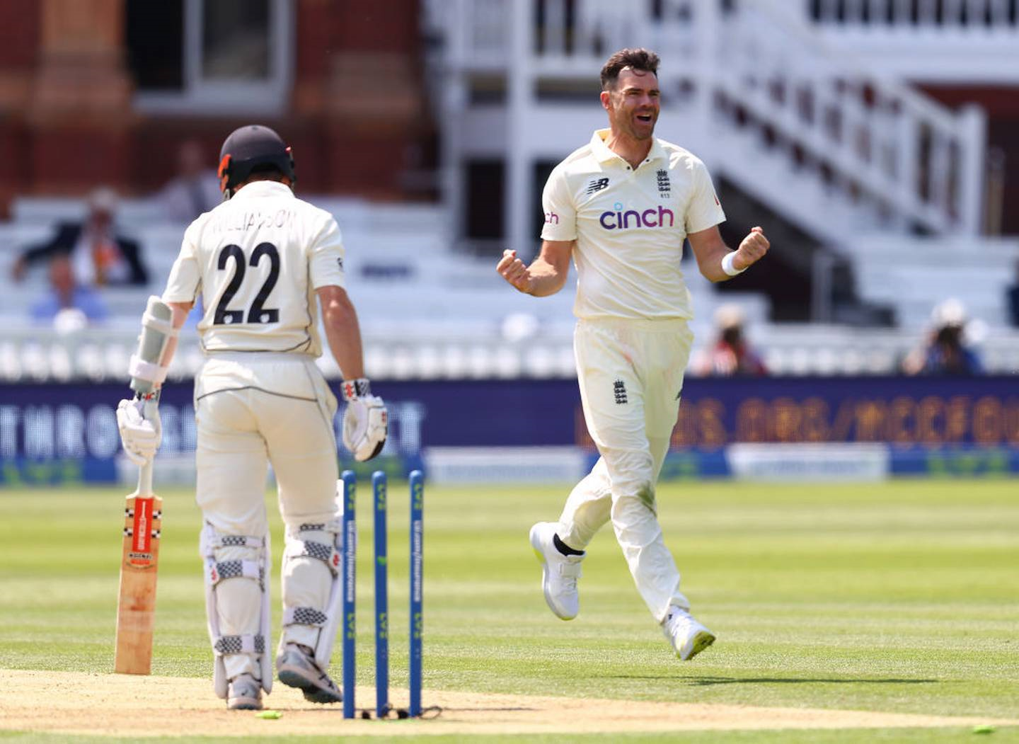 James Anderson of England celebrates taking the wicket of Kane Williamson of New Zealand. (Photo / Getty)