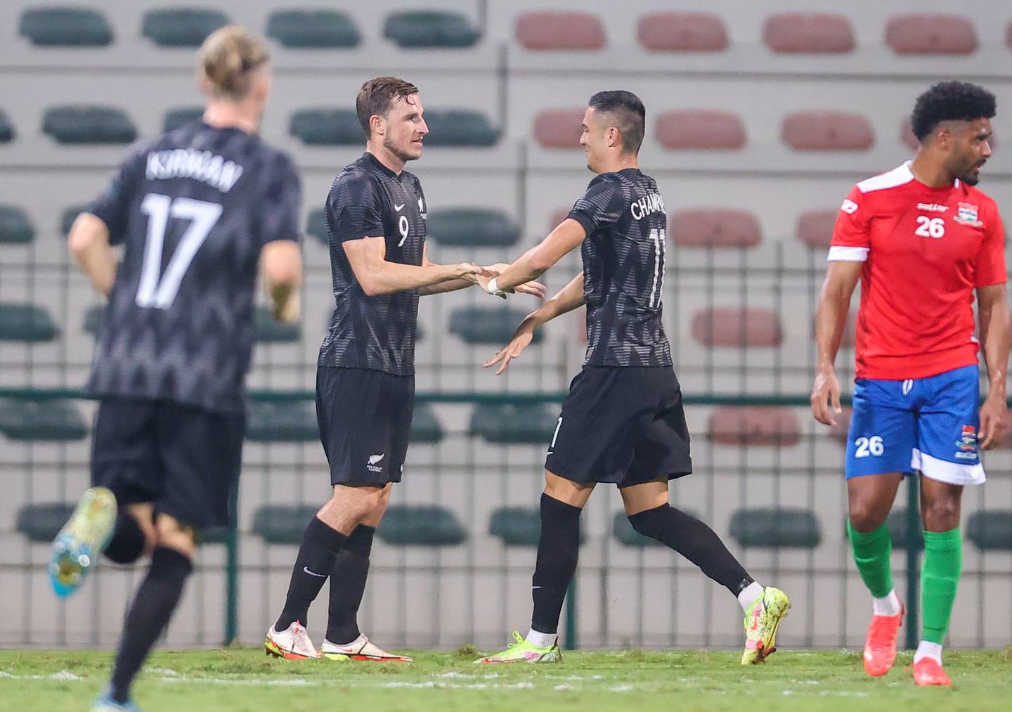 Chris Wood (L) of the New Zealand All Whites reacts with teammates after scoring a goal during their international friendly match against The Gambia. Photo / Getty Images.