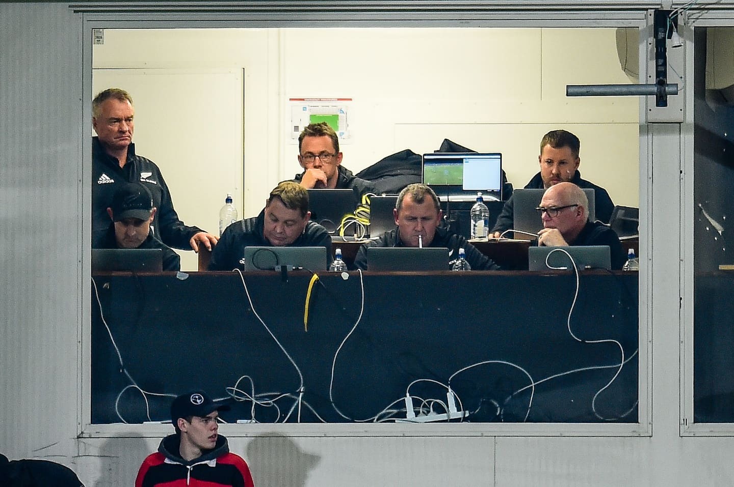 Grant Fox, Scott McLeod, Steve Hansen, Ian Foster and Mike Cron in the All Black coaching box during a practice match in 2018. Photo / Photosport