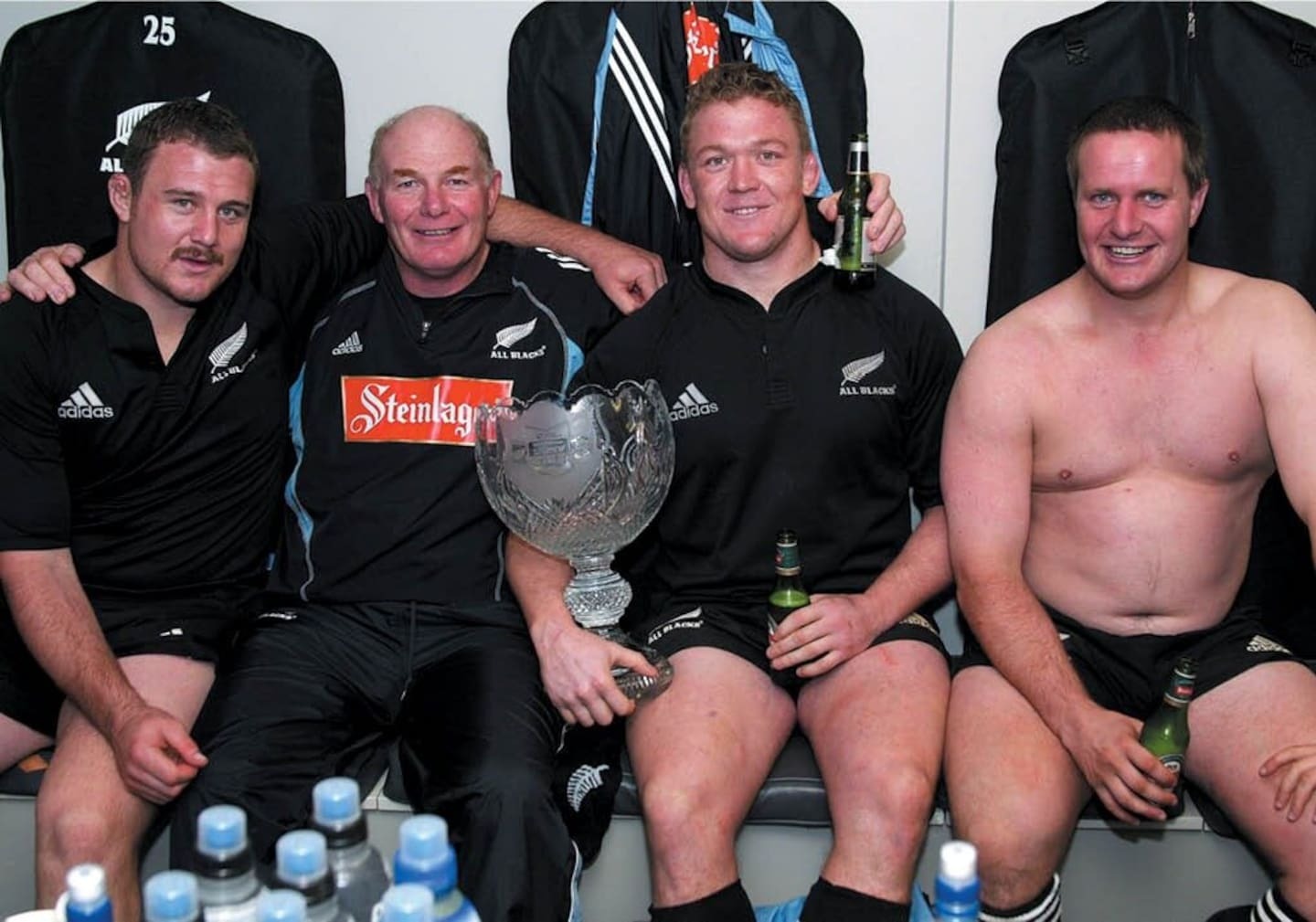 Mike Cron poses in the All Blacks sheds with props Tony Woodcock, l to r, Greg Somerville and Campbell Johnstone after the 3-0 series win over the 2005 British & Irish Lions. Photo / Supplied