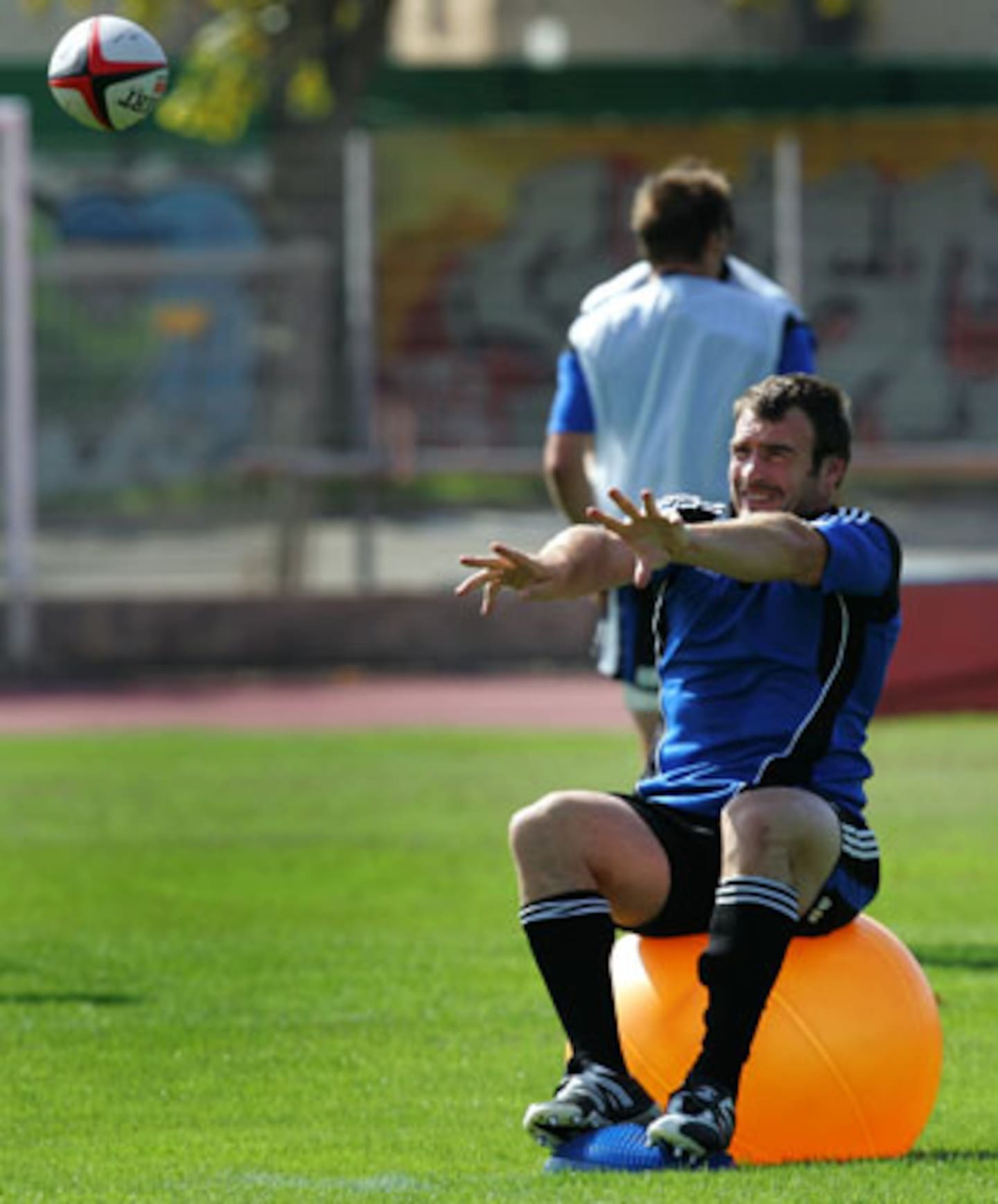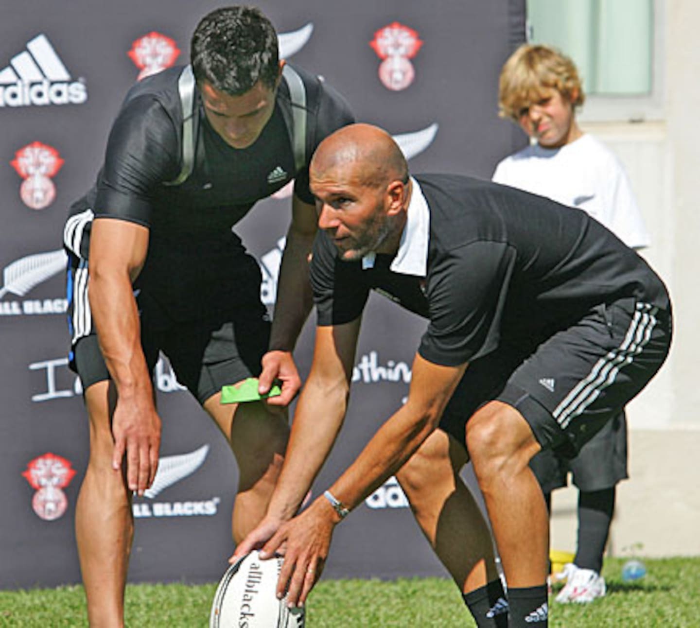 French football legend Zinedine Zidane gets some kicking pointers from All Black first-five Daniel Carter at the All Blacks hotel in Marseille during the 2007 Rugby World Cup. Photo / Brett Phibbs