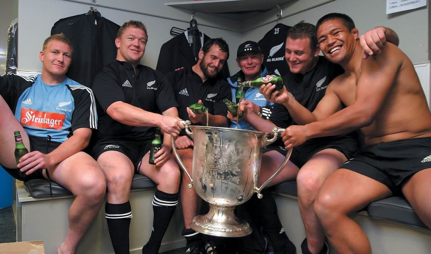 Mike Cron - third from right - and All Blacks players toast defending the Bledisloe Cup in 2005. Photo / Supplied