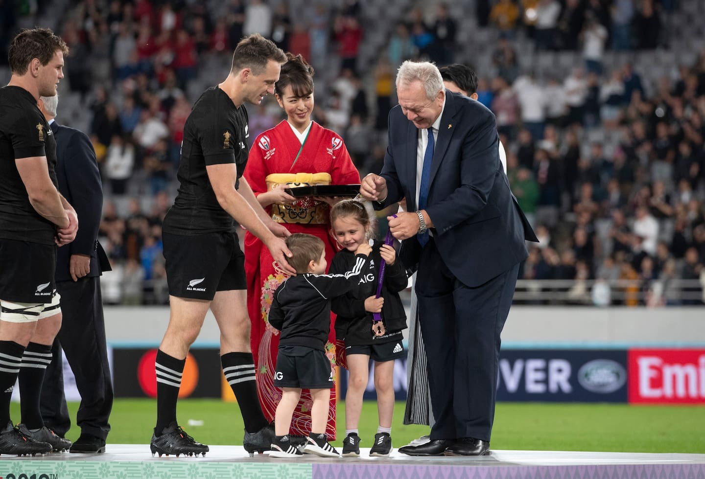 All Blacks wing Ben Smith has his children, Annabelle and Walter, receive his medal from World Rugby chairman Sir Bill Beaumont after the side finished third at the 2019 Rugby World Cup. Photo / Mark Mitchell