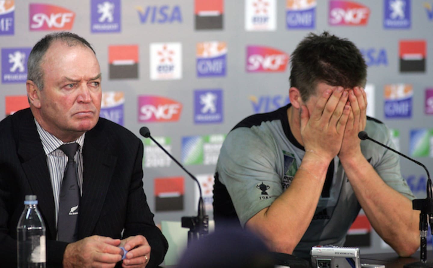 All Black coach Graham Henry and a dejected Richie McCaw at the press conference after their 2007 Rugby World Cup exit. Photo / Photosport