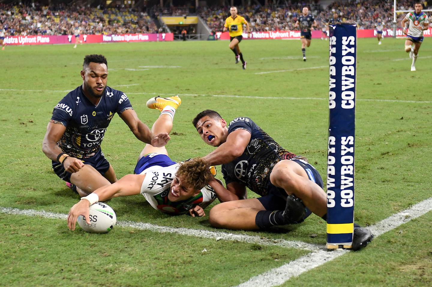 But the Cowboys wrested the momentum back, forcing three goal-line dropouts in quick succession. The pressure eventually told, though Adam Pompey and Marcelo Montoya got their wires crossed, allowing Kyle Feldt a soft run to the line.