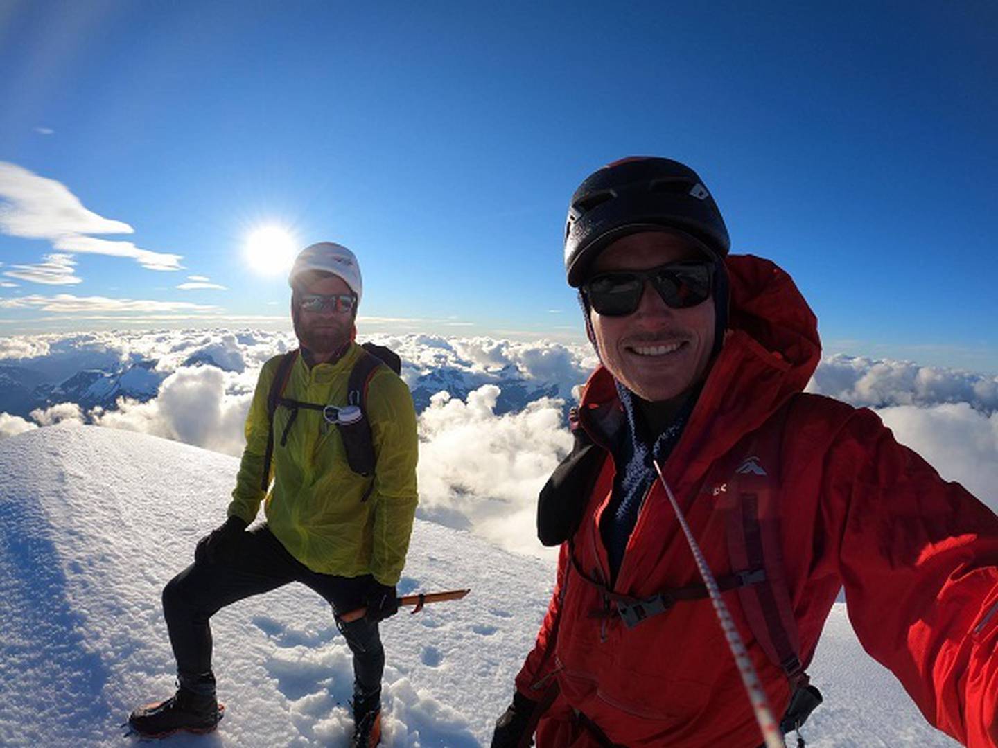 Hamish Fleming (left) and Alastair McDowell on the summit of Mt Aspiring. Photo / Alastair McDowellÂ