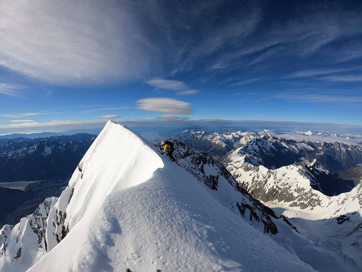 Hamish Fleming negotiates Aoraki Mt Cook's summit ridge. Photo / Alastair McDowellÂ
