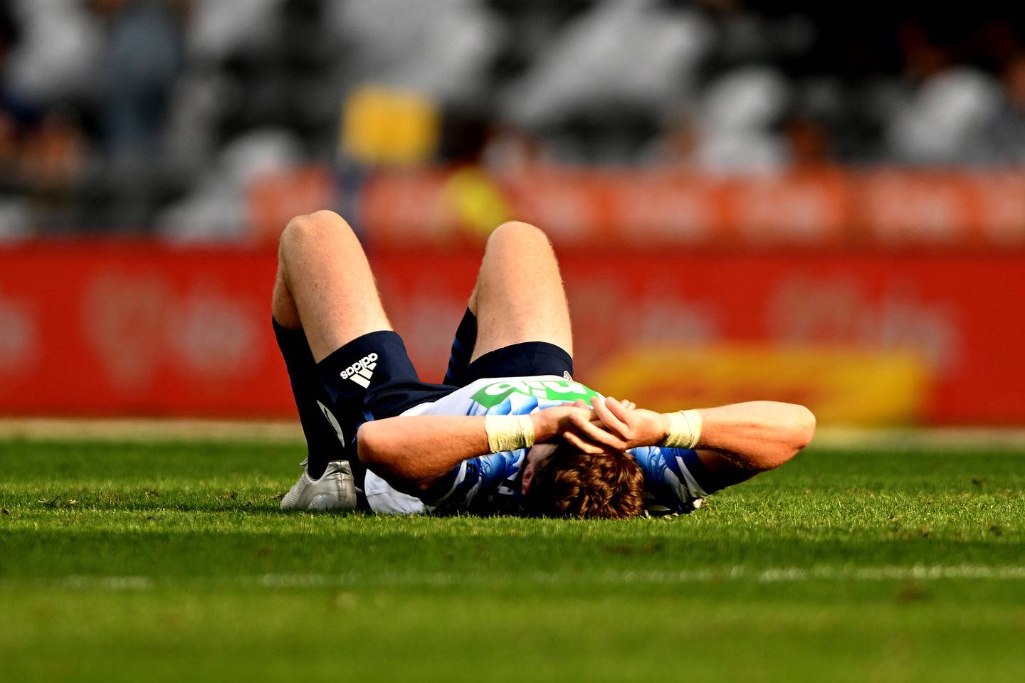 Beauden Barrett of the Blues lays on the ground after taking a knock to the head during the round six Super Rugby Pacific match. Photo / Getty Images.Â