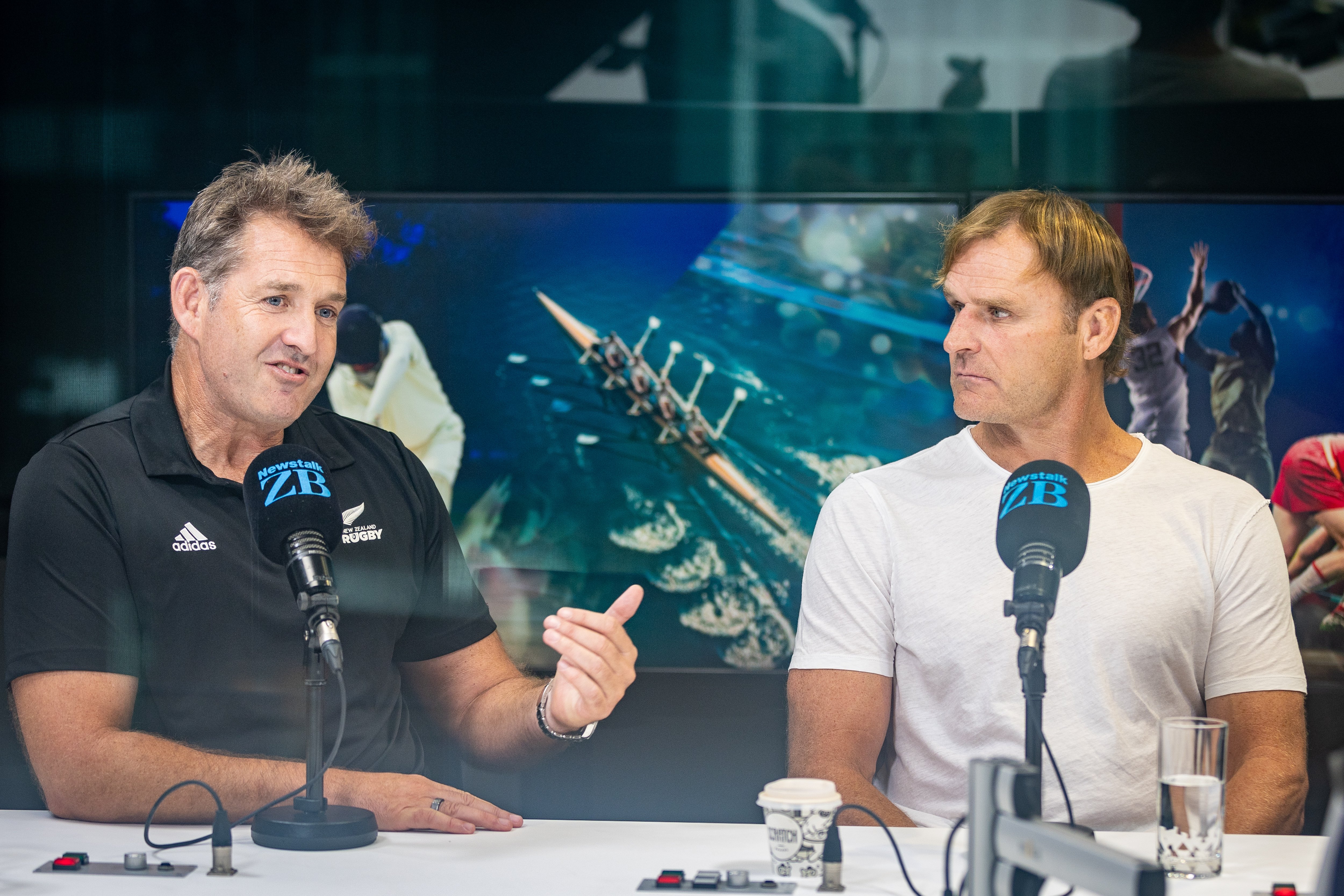 NZR CEO Mark Robinson and All Blacks Coach Scott Robertson in Newstalk ZB Studio Photo / Michael Craig