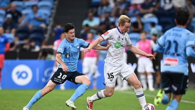 Francis De Vries celebrates with teammates after scoring a goal against Sydney FC. Photo / AAP