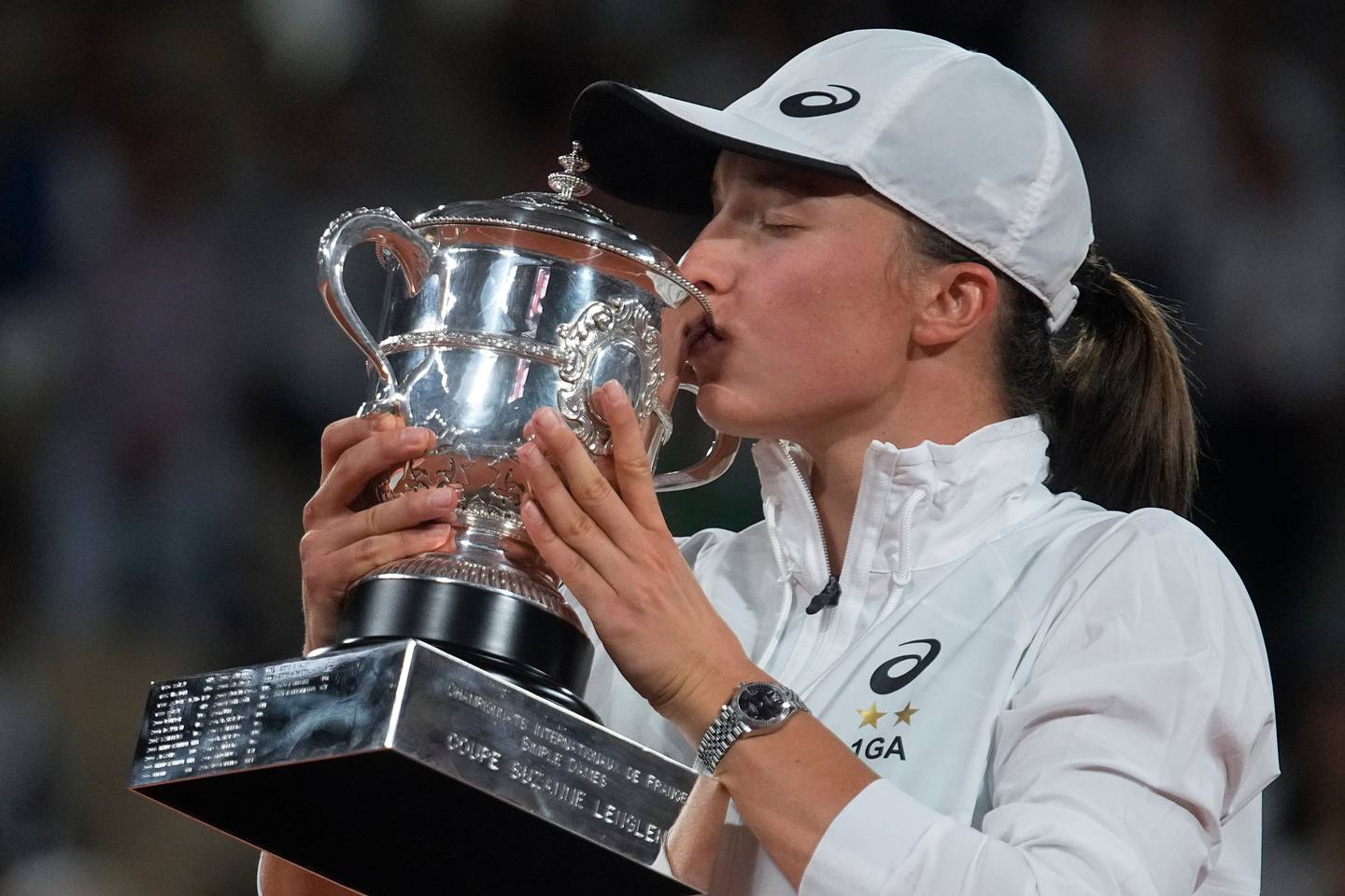 Poland's Iga Swiatek kisses the trophy after winning the French Open final against Coco Gauff. Photo /APÂ