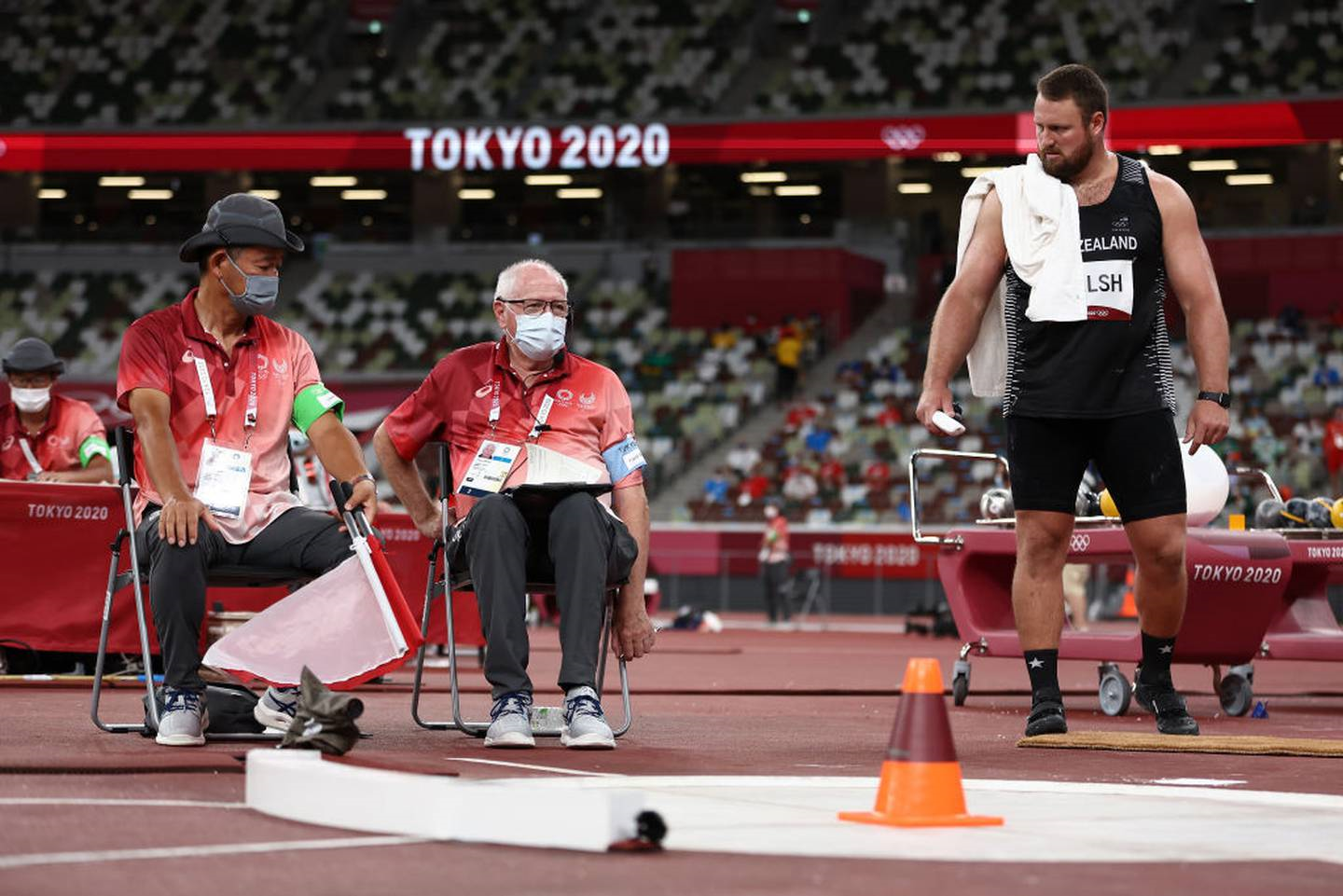 Tom Walsh speaks with judge Trevor Spittle during the men's shot put qualification. (Photo / Getty Images)