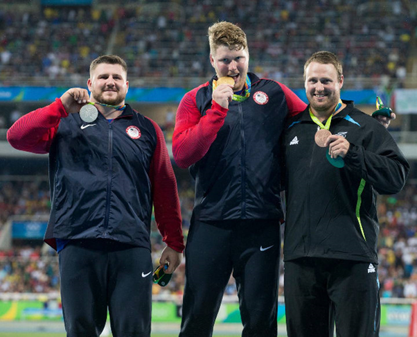 Joe Kovacs (L), Ryan Crouser (C) and Tom Walsh (R) on the podium at the 2016 Rio de Janeiro Olympics. Photo / Photosport