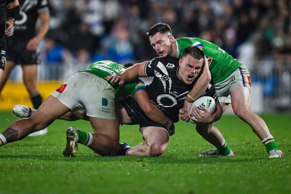 Jackson Ford is tackled by Canberra Raiders defenders. Photo / Photosport