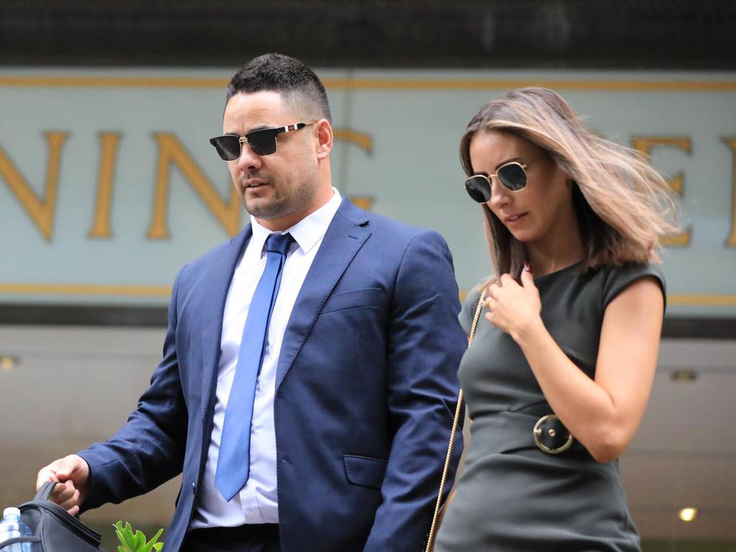Former NRL superstar Jarryd Hayne and his wife Amelia Bonnici leaving the Downing Centre Court in Sydney. Photo / NCA NewswireÂ