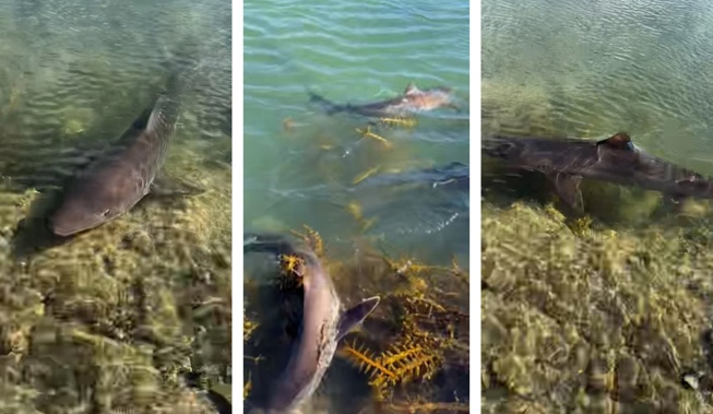 “I stopped when I saw splashing at the rock pools and went closer and saw the sharks in the rock pools and I have been going regularly to check. On Tuesday there were about 15 and when I went last night (Thursday) there were about seven, five of the seven were in an adjacent pool… it’s a stunning image, to see them so close.”