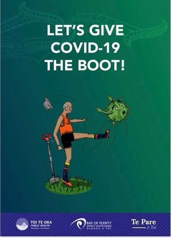 The publicity material, "Let's Give Covid-19 The Boot" issued by the Bay of Plenty District Health Board and its public health arm, Toi Te Ora Tauranga, provides information about the Pfizer vaccination with the Covid-19 virus portrayed as Māori.