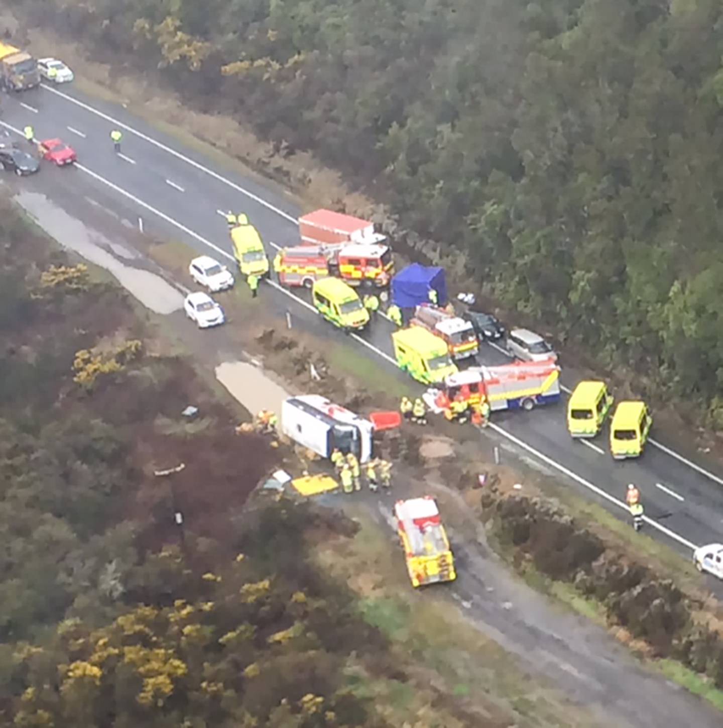 An aerial view of the scene after the tourist bus crashed. PHOTO / WESTPAC RESCUE HELICOPTERÂ