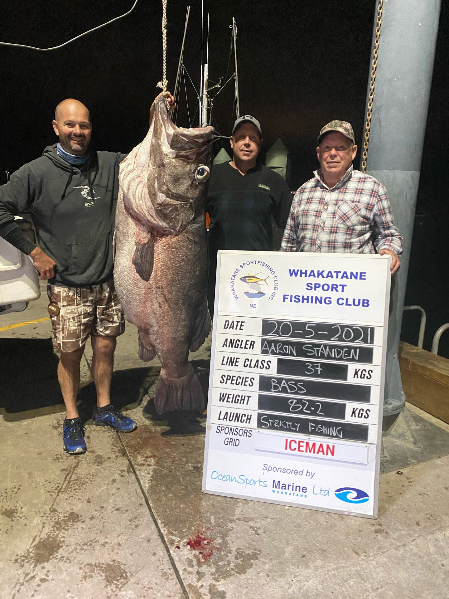 Aaron Standen, left, was on a Coastal Fishing Charters' fishing trip with mates Dave and Robbie Jones when he landed this 82.2kg bass. Photo / Supplied