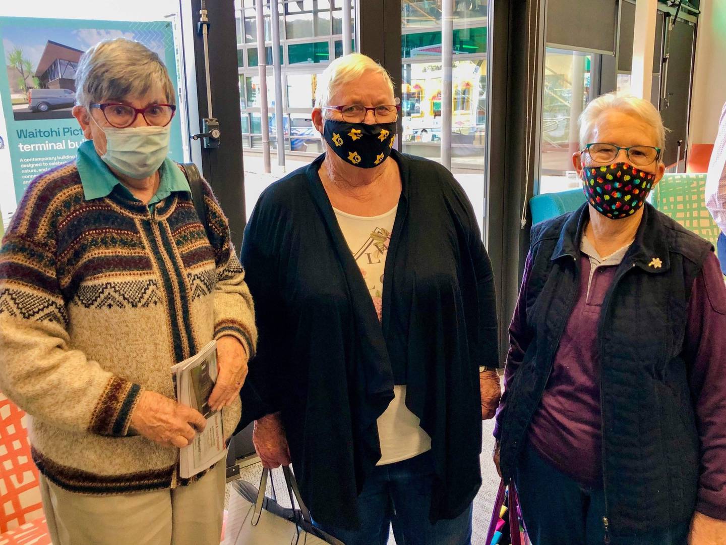 Picton "flower ladies" Helen Baxter, left, Margaret Frisken and Yvonne Rigby at a drop-in session where residents could learn more about the Picton ferry terminal upgrade. Photo / Maia Hart