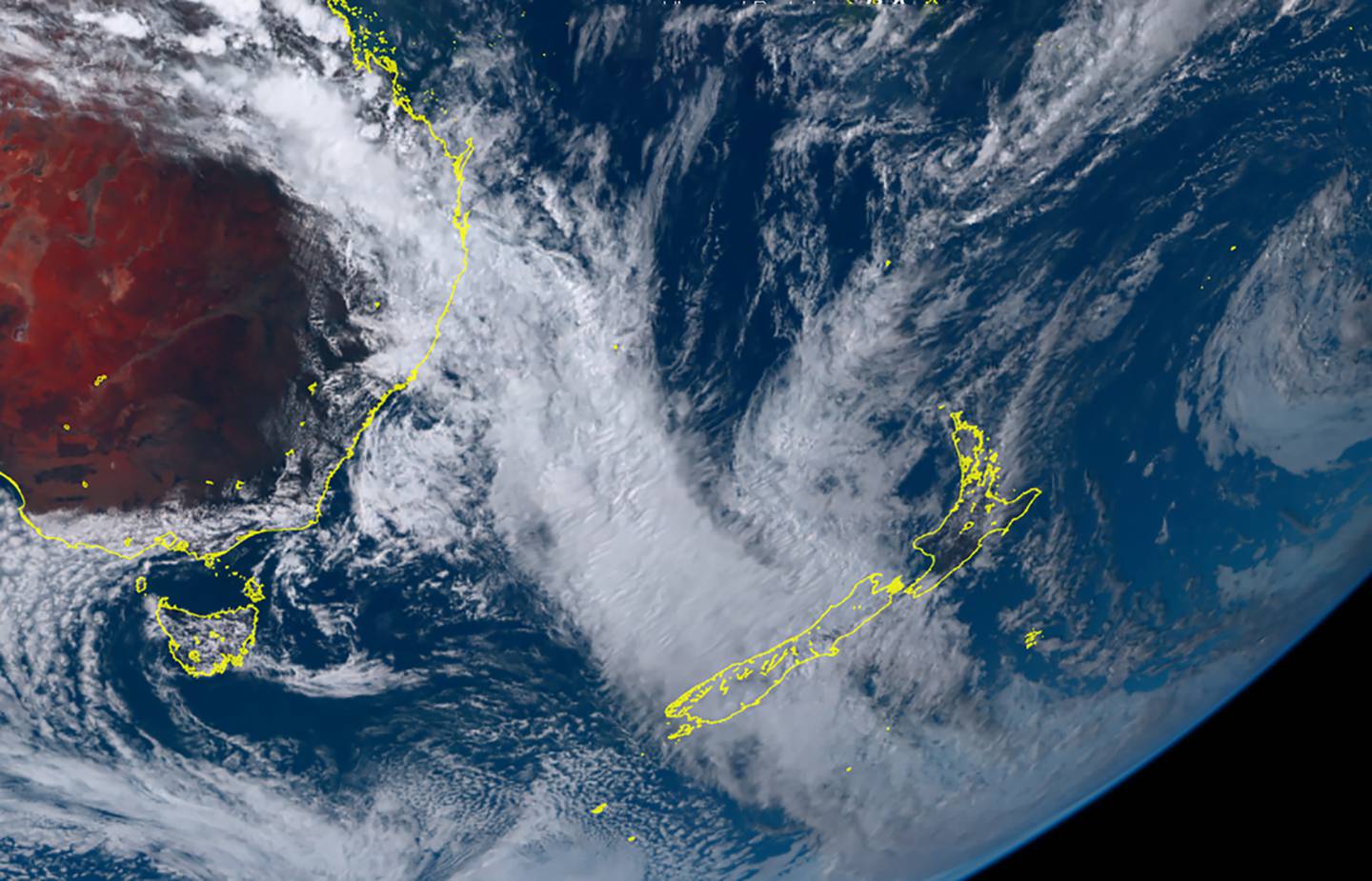 Satellite image shows an atmospheric river of cloud flowing from the tropical region funneling down over the west coast of New Zealand bringing heavy rain to the region. Photo / Supplied