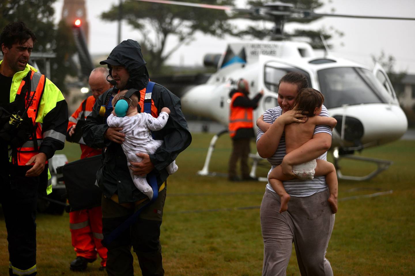 The mother and two young children in nappies were helped off the helicopter at the flooding response operations centre at the rugby grounds in Westport.