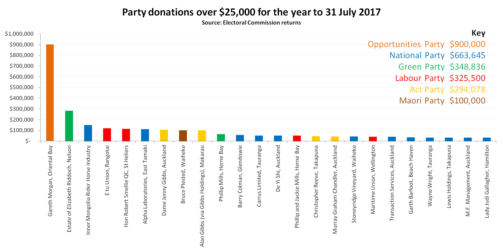 By contrast, the Green Party received $348,836, the National Party received $663,645, and Gareth Morgan donated $900,000 to his Opportunity Party.