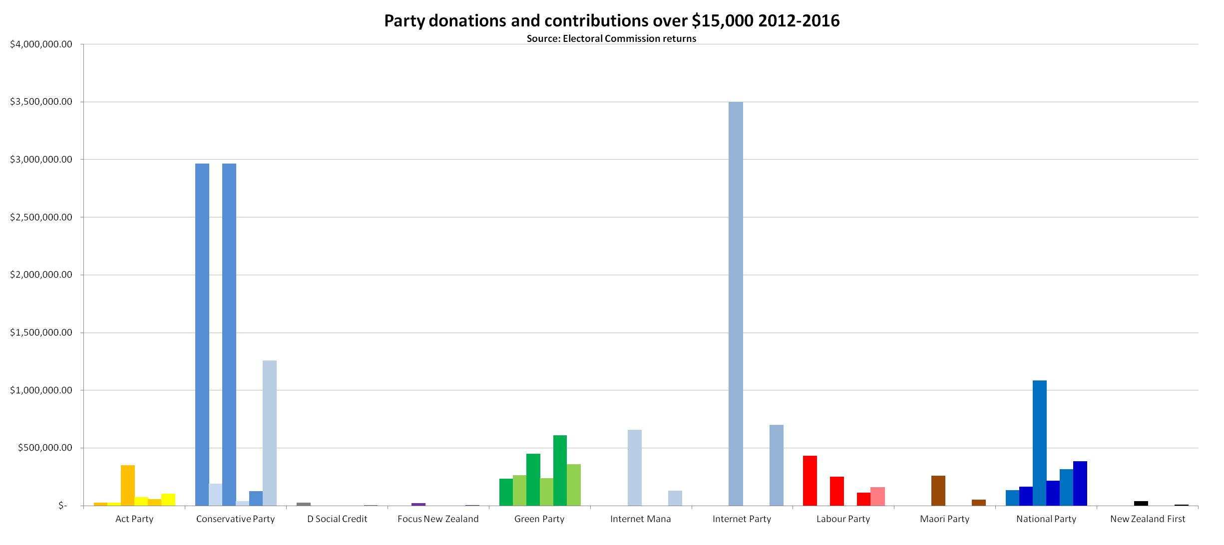 The Conservatives have received an average of $1,257,660 due to major contributions from former party leader Colin Craig and the Day family.