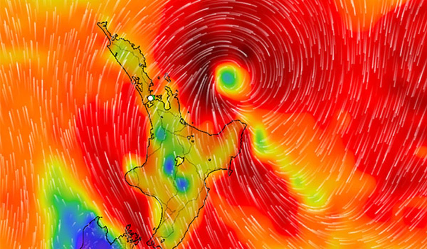 Wind map showing the forecast passage of Tropical Cyclone Fili as the clearly-defined centre lies to the east of the north island of New Zealand at midday 13 April 2022. Photo / Supplied