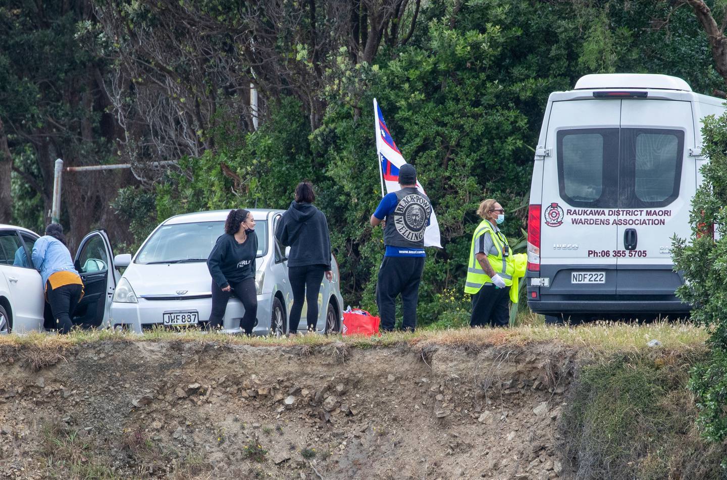 Protestors and Māori Wardens have set up check points on the road in and out of Shelly Bay. Photo / Mark Mitchell