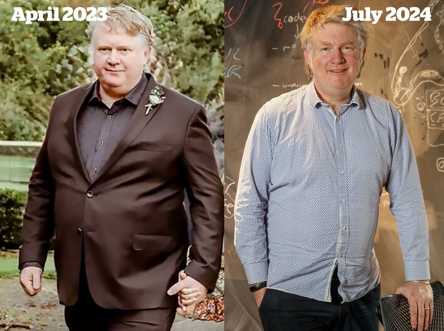 Finlay Thompson lost 30kg taking part in a trial of the drug Ozempic. He is pictured in his Wellington office (right), and in April 2023 prior to starting the trial (left). Photo / Mark Mitchell.