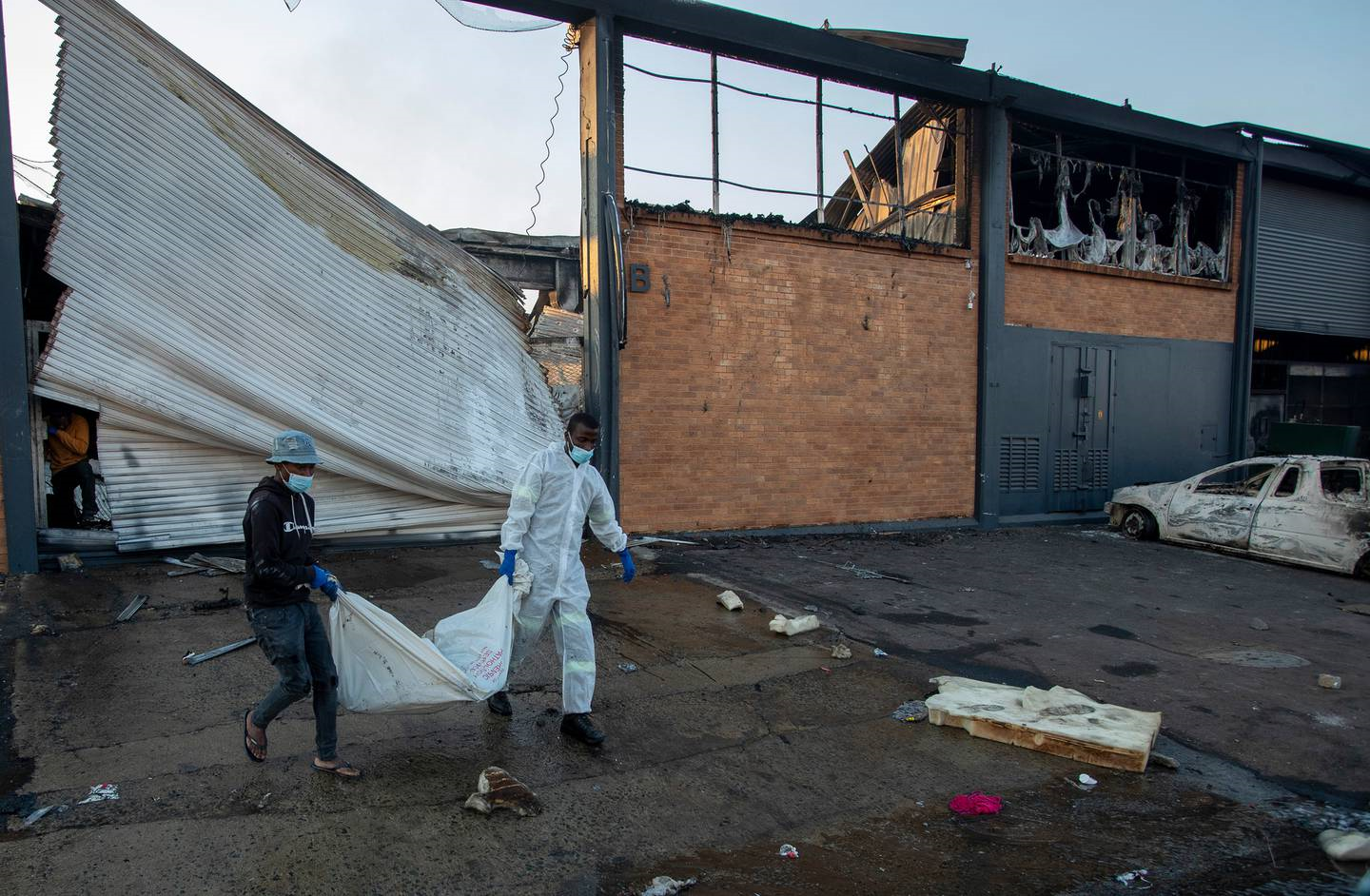 A family member assists a police officer to carry a body of a man who was found inside a burned shop in Johannesburg. (Photo / AP)