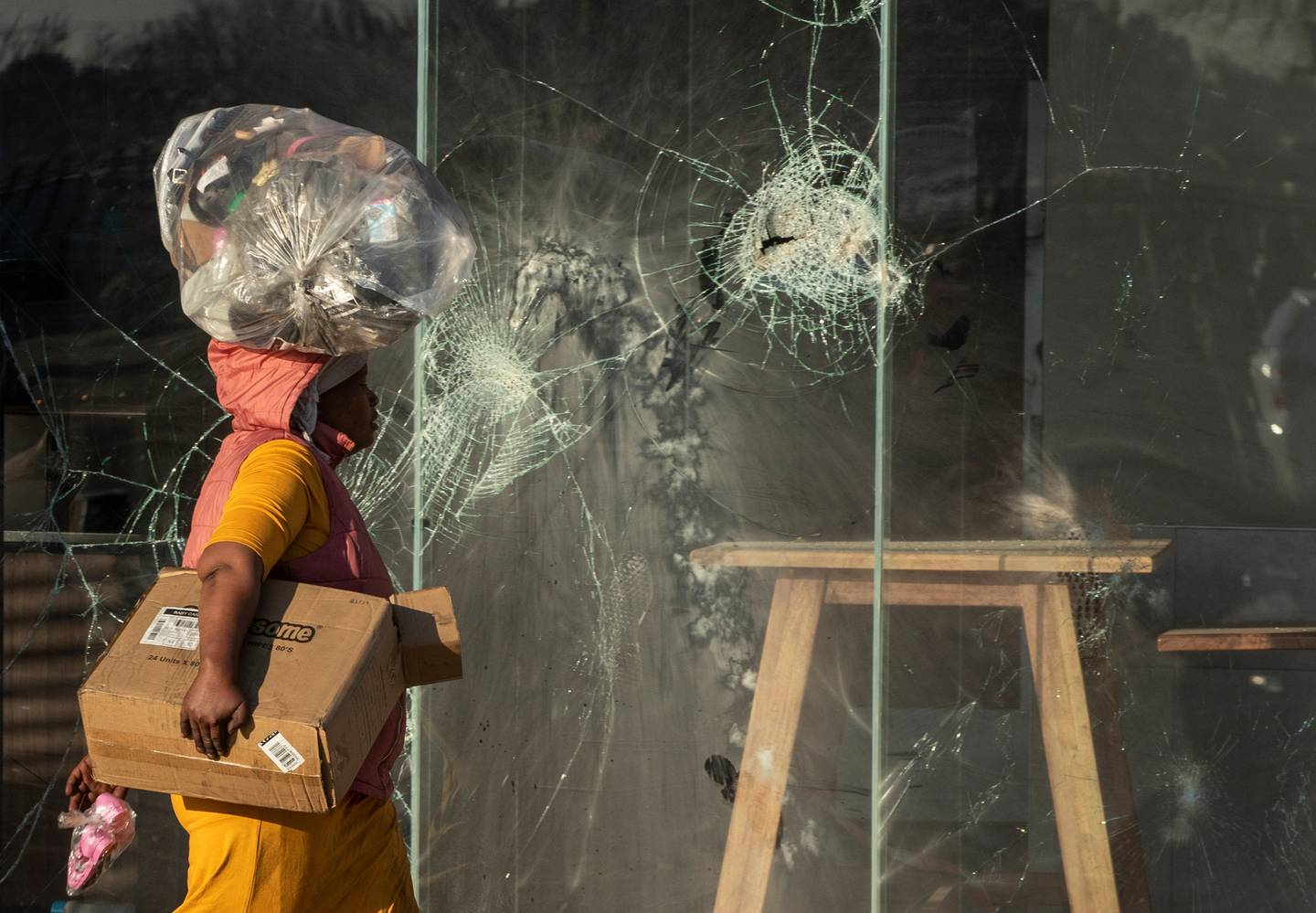 A woman carrying groceries looted from a nearby shop on her head at Naledi shopping complex in Vosloorus, east of Johannesburg. (Photo / AP)