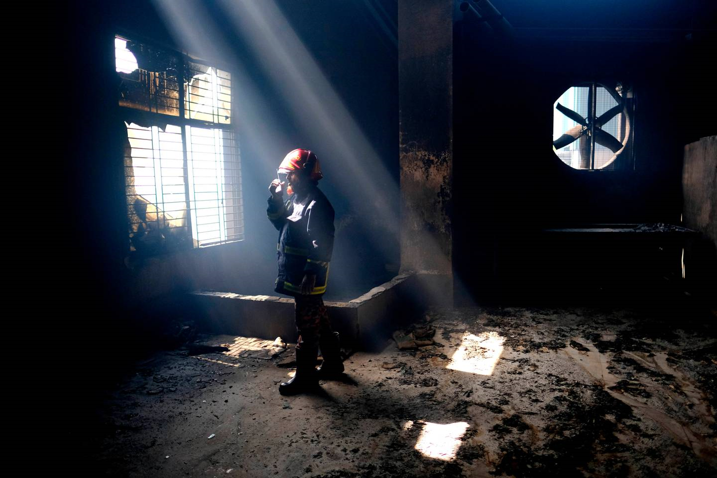 A firefighter communicates with his colleagues on a walkie talkie inside the burnt food and beverage factory. (Photo / AP)