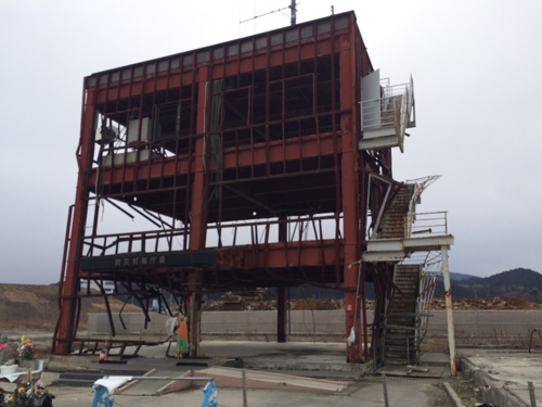 The skeletal remains and twisted metal of the Crisis Centre Building stands solitary in what was the bustling centre of the town as bulldozers were busy raising massive earthworks to form foundations for stores and factories as part of the new town, which will sit 10 metres higher above sea level as an added protection against future mega-tsunamis.