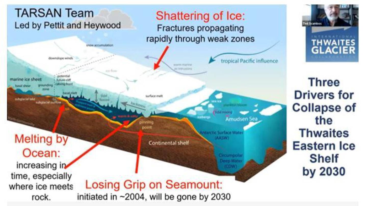 Research being presented about the three drivers for the collapse of the Thwaites ice shelf during the American Geophysical Union meeting. Photo / AGUÂ