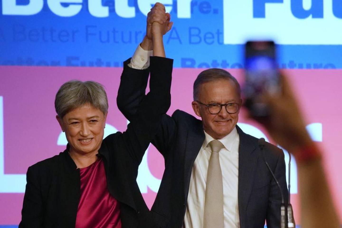 Labor Party senator Penny Wong and Leader Anthony Albanese celebrate winning the Australian federal election. Photo / APÂ
