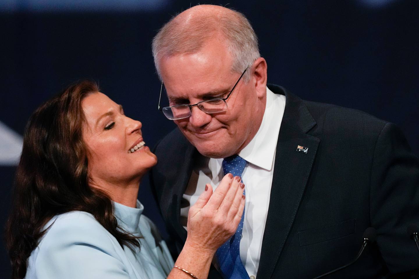Australian Prime Minister Scott Morrison is embraced by his wife Jenny as he addresses a Liberal Party function in Sydney last night. Morrison quit as Liberal leader. Photo / APÂ