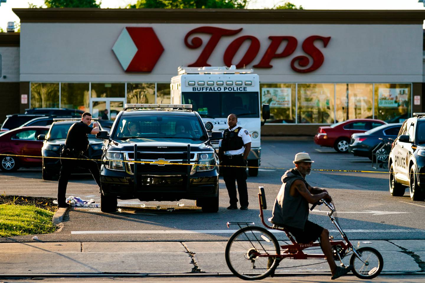 A cyclist pauses passes the scene of the shooting at the supermarket, in Buffalo. Photo / APÂ