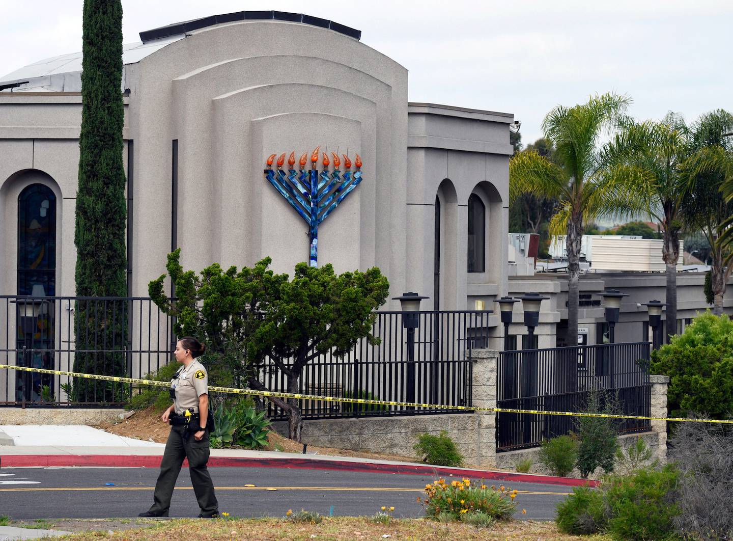 A San Diego county sheriff's deputy stands in front of the Poway Chabad Synagogue in 2019. Photo / APÂ