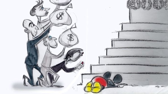 Also shown is a prostrated Mickey Mouse, the symbol of the Disney Company, which owns ABC News. The television network recently reached a US$15 million ($26m) settlement with Trump after he sued for defamation over reporting on his sexual abuse trial in New York.